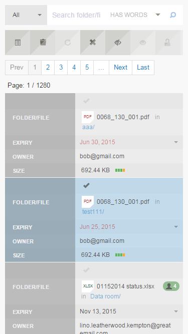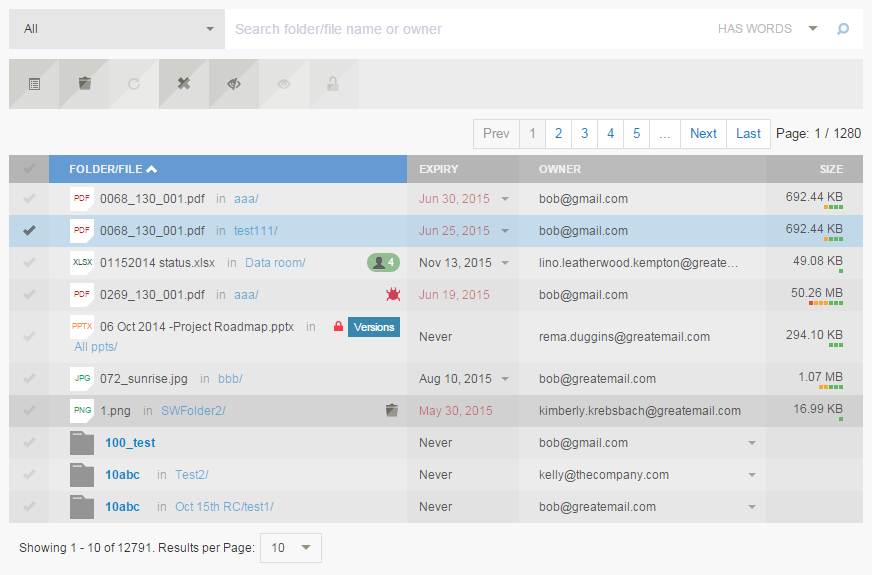 - Select single or multiple rows. Custom action buttons can be enabled based on the specific properties of the selected rows (e.g. enable the "Unlock" button if there is at least one selected row in Locked status).