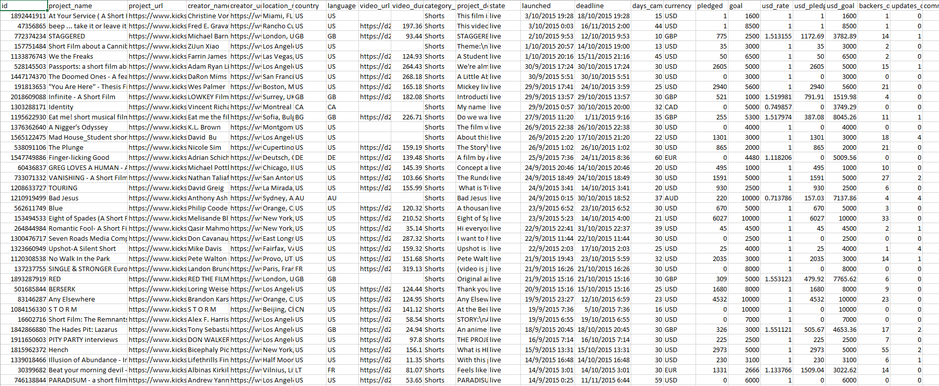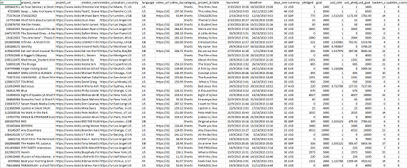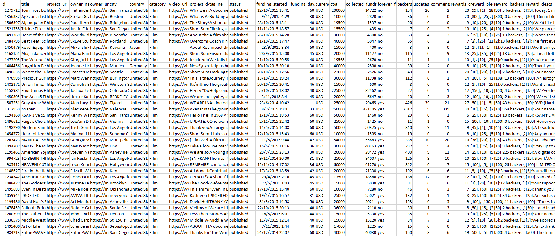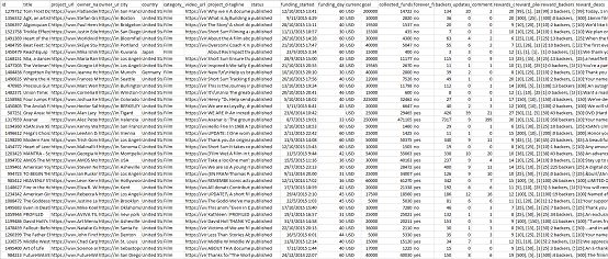 Typical CSV result from scrapping Kickstarter